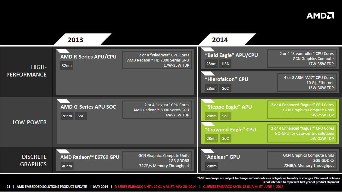 This launch fills out the middle of AMD’s 2014 embedded products stack and follows up on the launch of the Bald Eagle APU back in May. We have yet to see heads or tails of AMD’s Hierofalcon CPU which is an embedded version of AMD’s first ARM chip. That said as of this time everything points to it being still on track for sometime in the later half of this year.