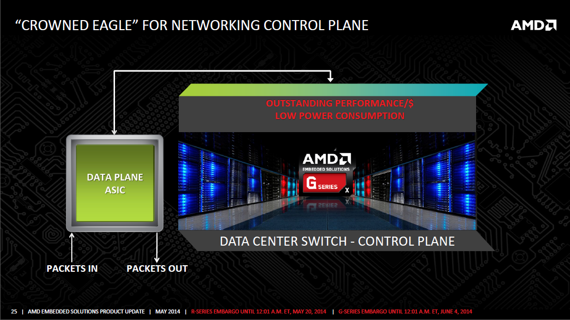 One of the killer applications for this chip that AMD is envisioning is data center switching. In this scenario one of these G-series chips would be used to control the follow of information on the network inside of a modern data center. AMD is also hoping that the G-series will be used to do security processing and high volume encryption thanks to its AES hardware acceleration capabilities.