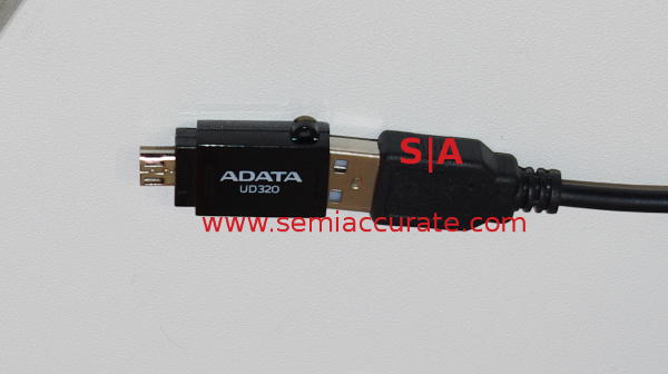 One of the least expected items at the show, not just at the Adata stand, was the above USB on-the-go dongle. Technically it is called the UD320 and comes in 16 and 32GB capacities. Why is this interesting? Because unlike most of the other OTG drives out there, the UD320 has a full-sized USB port out the back that acts like a pass-through while the drive is plugged in. The demo had a UD320 with a game controller stuck in the back playing games on a tablet, a very useful additional piece of functionality. No one else at Computex that SemiAccurate saw had a similar device.