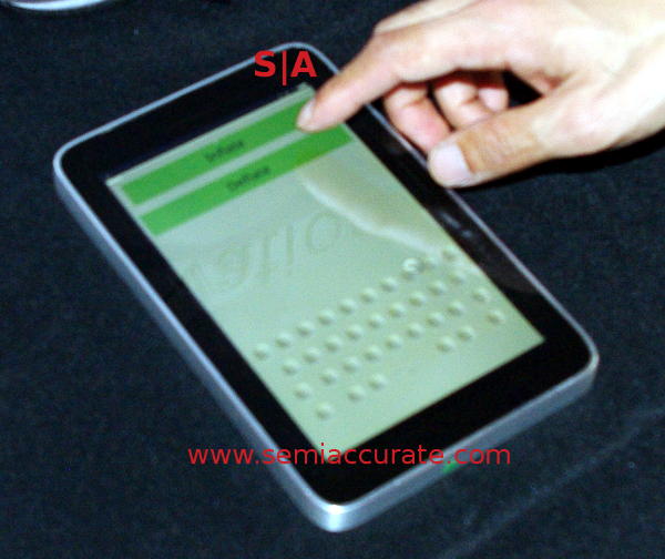 The first one is visually the most interesting and that is Tactus, the so called inflatable screen technology. Tactus uses micro-pumps that use similar technology to artificial muscles to pump optically matched oil around. This oil goes through microgrooves in a polymer layer on top of the screen to inflate bumps over the keys.