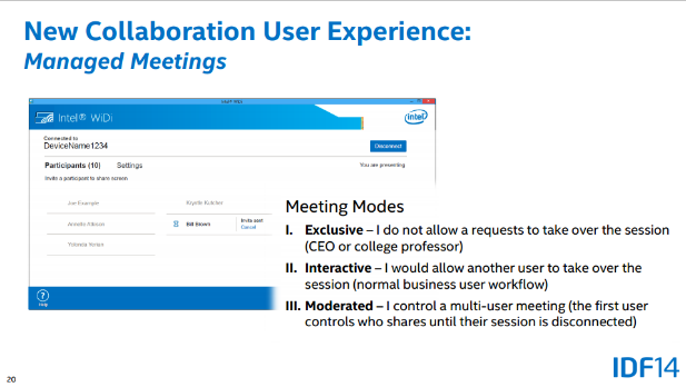 Intel has also implemented a new UI and a variety of managed modes for controlling who’s in charge of a given wireless display for business and educational environments. These modes are exclusive which blocks request to take over the stream, interactive which allows other users to take over the stream, and Moderated where one user controls who has the display stream. Of course if you get the vPro version then all of this becomes a remote managed solution. Intel has also intergrated their wireless display solution into Windows 8.1 share charm which makes it drastically easier to use and configure.