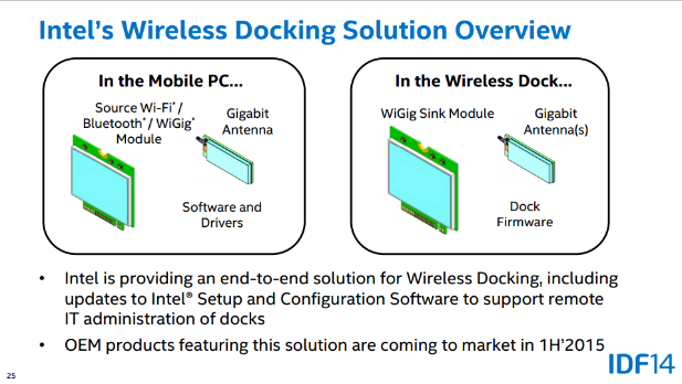 After wireless displays comes wireless peripherals and a solution that Intel calls Wireless Docking. There are plenty of wireless keyboards and mice on the market right now, but they all have one big flaw. They require that you plug a dongle into a USB port for the device to work. With Intel adoption of WiGig these dongles will be a thing of the past. As I mentioned at the beginning of the article WiGig is a high frequency, high bandwidth, low latency wireless protocol which makes it perfect for connecting lots of devices that are short distances from the PC without spamming everything around it with RF interference. For example imaging walking into a cubical setting down your laptop and having all your peripherals connect based on your proximity to them without accidentally interfering with anyone else’s wireless devices. Through Intel’s Wireless Docking you can also connect to two close proximity monitors. Intel is offering this functionality again to avoid saturating the wireless spectrum available in an office with dozen of Miracast connections which have a circular range of 50 or so feet where as WiGig connections are only good for two to four feet.