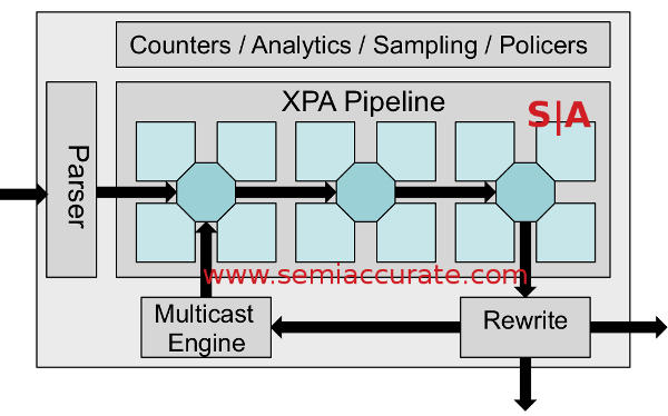 The way this is accomplished is via a generic architecture with a few fixed bits, namely the initial Ethernet frame parser and a few other things like the multicast engine later on. The rest in the middle of the XPA pipeline picture above is a blank slate that you load tables, not code, into at boot. These tables are then used to parse the packets and forward them to the next table, rinse and repeat until you are done or hit the end of the line.