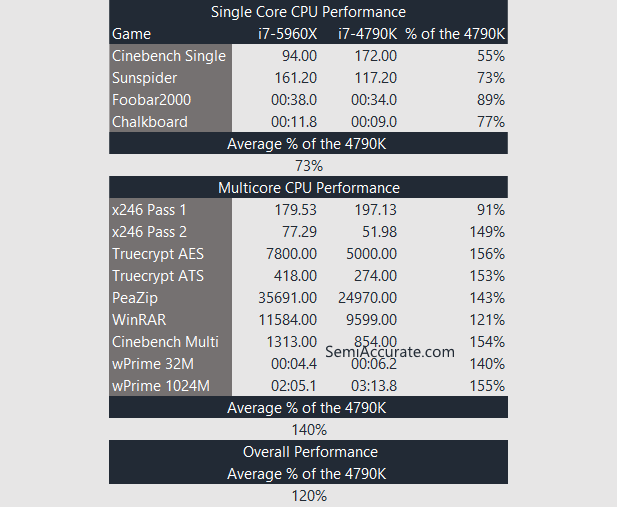 Intel’s Core i7-5960X is an excellent chip and the X99 platform offers the latest and greatest of everything but unless you spend all day encoding videos, rendering movies, or editing photos the i7-4790K will be a better choice for consumer applications than this workstation chip. That doesn’t mean it’s the wrong choice for you, or that’s it’s at all a bad choice, but you should know exactly what applications you run that demand this kind of multithreaded monster before you throw down your cash.S|A