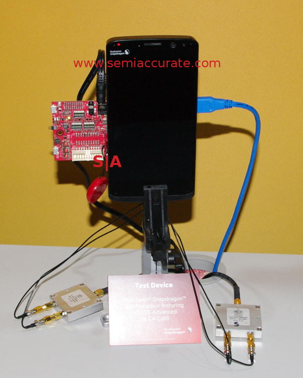 The idea is simple enough, take three disparate carrier bands totalling up to 40MHz (20+10+10Mhz) and treat them as a single pipe. This aggregate bandwidth is what allows the peak data rate of 300Mbps, it is essentially four 10Mbps 75Mbps channels worth of bandwidth (Note: Over three actual channels) treated as one pipe. You can see the demo hardware, basically a QCA8994 aka Snapdragon 810 development device, below.