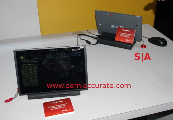 The demo wasn’t much to look at but it did work. The 4K video was sent from the tablet in the foreground to the one in back which played it on a 4K monitor above via HDMI. There was also the Iperf bandwidth benchmark running to measure the remaining throughput. In this case that number hovered around the 180MBps/1.6Gbps mark and the video of course did not waver. In short it did what Qualcomm claimed it would.