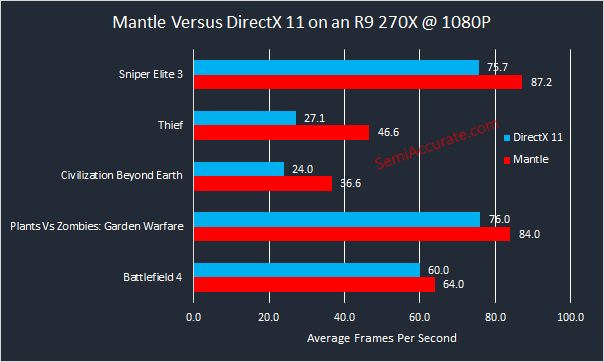 Things get off to a slow start in Battlefield 4 and Plants Vs Zombies with a ~10 percent improvement in both games. But Mantle knocks it out of the park in Civilization and Thief where both games are able to break the 30 frames per second barrier on our R9 270X. Sniper Elite also shows a solid gain.