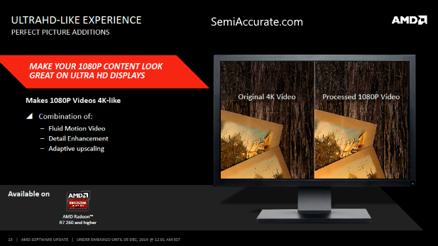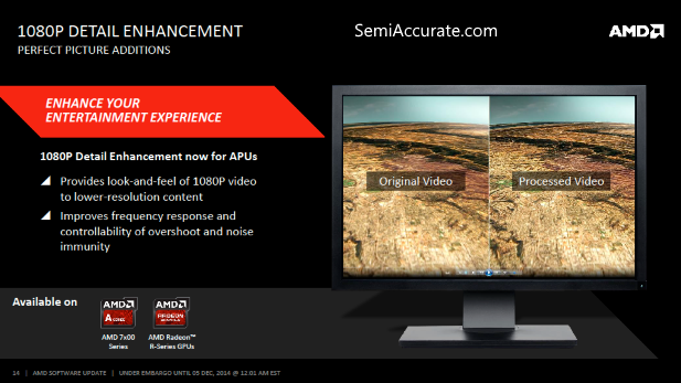 AMD is also offering detail enhancement processing and upscaling for videos with resolutions of less than 1080P to the full HD standard. There’s not a whole lot to say here other than AMD’s video quality enhancement and upscaling features make low quality videos look better. Whether that’s a must have feature is up to you.