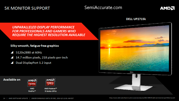 With the launch of Apple’s revised iMac last month it was clear that AMD would at some point begin offering support for 5K displays. Well that day is here as AMD is announcing support for 5K displays like this Dell unit at 60Hz using a pair of DisplayPort 1.2 cables. Resolution mania is finally starting to get rolling in the desktop world. I for one welcome our new 5K display overlords. (sRGB compliant, 144Hz, and FreeSync please)