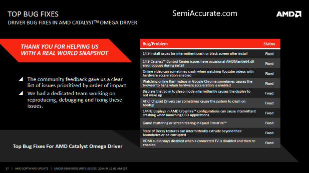 As part of these efforts to ensure stability and squash bugs AMD believes that they’ve knocked out the top ten most reported issues with their Catalyst 14.9 driver. A meaningful effort to find and fix bugs is praise worthy accomplishment, but as always AMD needs to prove that this is a sustained effort rather than just a one-time deal.