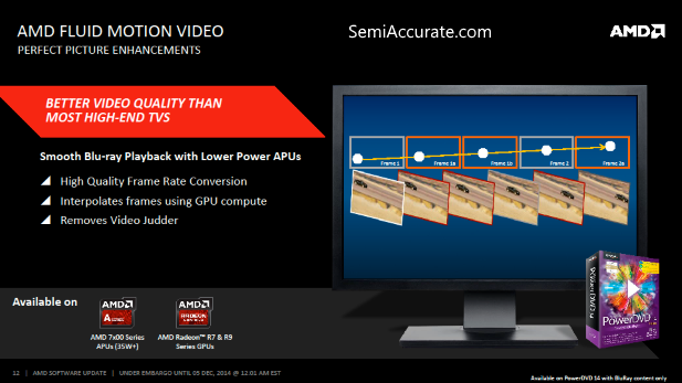 AMD is updating its Steady Video technology with the release of Fluid Motion Video which reduces jerky movements in videos by analyzing camera movements and displaying interpolated video frames to smooth out motion in video streams. This is a really neat technology that will likely offend some movie fans as some of the frames you’ll see with this technology aren’t cannon.