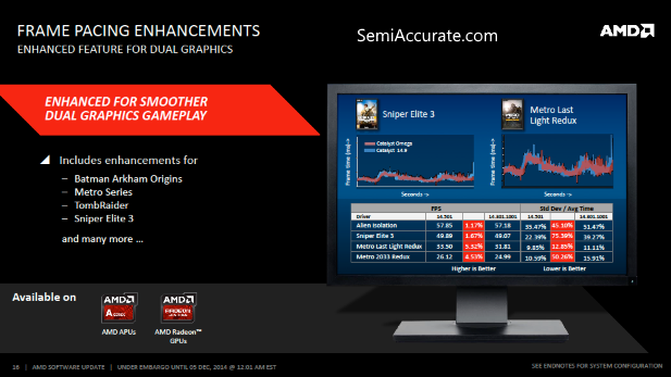 In addition to working on their frame pacing for CrossFire configurations AMD has also updated their frame pacing algorithm for Dual Graphics configurations. Earlier this year we looked at the usability of Dual Graphics on both laptop and desktop systems and came away with a rather negative impression. While this update will certainly help users of those configurations its unlikely to change the conclusion from our initial review.