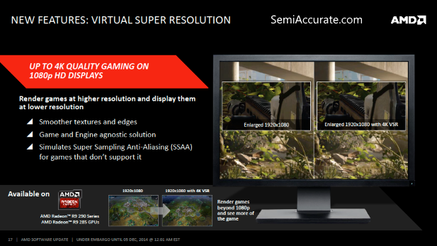 Virtual super resolution is AMD’s counter to Nvidia dynamic super resolution. Both features allow your graphics card to render a game at a higher resolution than your monitor supports and then scale that image down for display. The effect is similar to that of super sample anti-aliasing but the games being super sampled are entirely unaware of what’s going on and do not have to explicitly support this feature. The only downside is that UI elements like in-game menus may not scale well to higher resolutions. In any case if you’re willing to take the performance hit VSR is one of the highest quality ways to perform anti-aliasing.