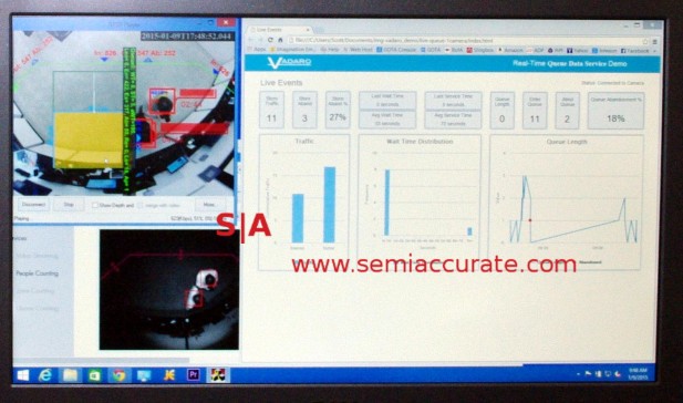 Next up was a demo from a company called Vadaro for video analytics using the Imagination Raptor ISP. What Vadaro does is to take a video of things like checkout lines at a supermarket and analyze how many people are in line, how long the line is, and how many people walk away. The interesting bit is that the analytics are all done on the camera itself where possible, thanks of course to the Imagination hardware.