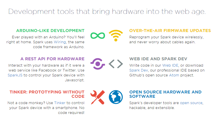 Spark prides itself on providing all types of users with the tools they need to develop with their kits. From the Tinker phone app that allows you to read the real-time voltage levels of the GPIO pins and set temporary parameters for them to the fully open source libraries, development tools, and an Atom project-based IDE that Spark supplies with its development boards the software ecosystem is the biggest value add of Electron over competing solutions. Even more interestingly the Electron is supported by Spark’s Spark Cloud API which is a REST-style API users can interact with the Electron like they would with Twitter or Facebook’s API.