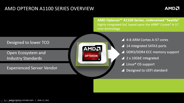 In a presentation at World Hosting Days AMD released new details about its plans and expectations for its ARM-based server chips. Dubbed the AMD Opteron A1100 Series AMD’s first entry into this market has been consistently promoted by the company over the past two years as the driving force behind their effort to recapture the server market. In AMD’s presentation the company argued that its A1100 series of SoCs are a perfect match for the hosting market because of the need for workload load optimized solutions and the innovation possible thanks to the health of the ARM ecosystem. AMD also reiterated the commitment of its software, hardware, and OEM partners including HP, Cisco, and Microsoft to the creation of a viable ARM server market.