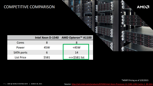 Surely the most interesting item that AMD discussed in this presentation was the market positioning of its A1100 series APUs which are a minimum four months late to market based on the last public roadmap and currently only available upon request as a development kit to the general public. A sub $581 price point is the ceiling for AMD’s per unit pricing structure on its A1100 series chips. Just to emphasize the importance of this point: AMD’s Opteron A1100 Series of SoCs will sell for less than $581 per unit. AMD is going to enter the ARM server market with a pricing strategy designed to undercut the structure that Intel has laid out with its Xeon D series chips.