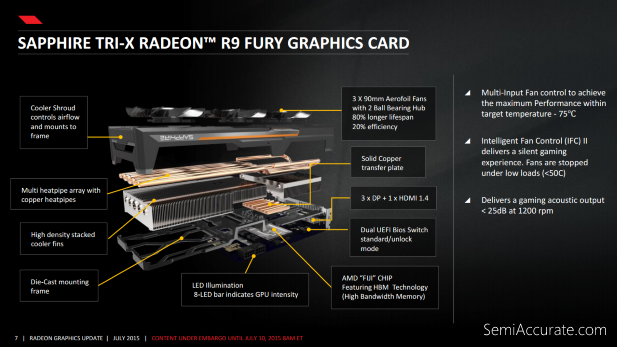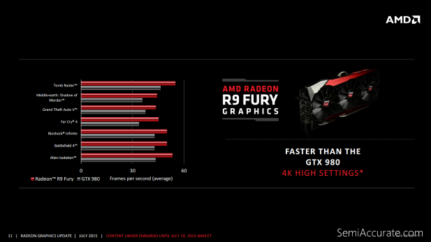As far as performance is concerned AMD is targeting this X less Fury to take on Nvidia’s venerable GTX 980 (non-Ti). This is a target which according to AMD’s own benchmarks, of course, it bests handily. Based on the performance levels that the Fury X offered I’d be surprised if this slightly handicapped Fury didn’t beat the regular GTX 980.