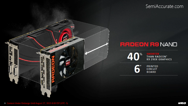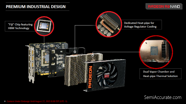 Compared directly to the R9 Fury X this means that the R9 Fury Nano is about ten percent slower but it also cuts power consumption down by an astonishing 100 Watts. With drastically reduced power consumption on the part of this bin of the Fiji GPU a variety of knock on effects occur.