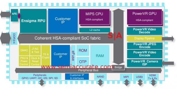Imagination then stepped up to the plate with what is probably the most significant new bit of hardware news, MIPS CPUs and PowerVR GPUs are going to be HSA compliant. This will happen in a “Staged roll-out from 2016 onwards” so you can expect it to be shown off early next year. The chip above is probably the successor to one that made its debut at CES 2015 so you can do the rest of the math..