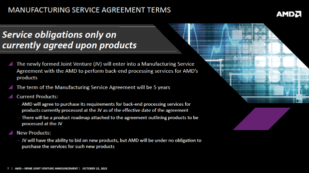 AMD has signed a 5-year agreement to continue using the facilities it’s selling to the new Joint-Venture for its current products. This will ensure that this deal doesn’t cause any production interruptions for AMD’s existing products. For AMD’s new products the Joint-Venture will have to bid on the contract just like any other company. This is a far better deal that the onerous wafer supply agreements that AMD had to sign with its last major selloff which resulted in the creation of Global Foundries.