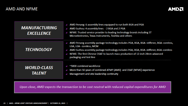 Just before its earnings call today AMD announced that it had signed an agreement with Nantong Fujitsu Microelectronics (NFME) to create a new joint-venture that will free AMD from most of its remaining manufacturing assets including its facilities and most of its employees in Malaysia and China. AMD will receive $371 million dollars from NFME in exchange for contributing those facilities and almost 1,700 employees to the new Joint-Venture. NFME will have a controlling 85% ownership stake in the Joint-Venture while AMD will hold on to the remaining 15%.