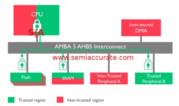 Luckily ARM has a solution to this issue as well, it is the new AMBA 4 AHB5 interconnect. On a basic level it is similar to AMBA 3 AHB3 but with more features. It supports more memory types but not as many as AXI, can do semaphore based multi-CPU operations, and now supports user defined sideband signaling. Better yet it adds multiple logical interfaces for a single slave interface so you can address multiple peripherals over one bus. This may sound silly but in the gate, size, power, and cost constrained world of microcontrollers, it is a very big win. Last but not least AMBA 5 AHB5 supports the passing of explicitly marked secure and non-secure transactions so peripherals can keep state correctly.