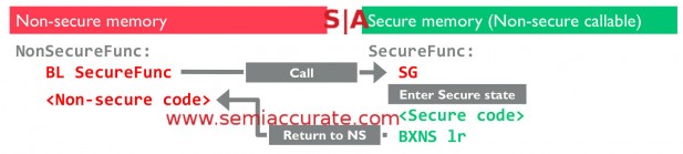 Actually there are two more instructions needed to do this, you can’t just do an arbitrary jump to an NSC region and still maintain a semblance of security, it wouldn’t take long for a malicious program to test every memory location and map out all the SG op locations. To call a NSC region you need to specifically use the BLSF or BLSecureFunction opcode which requires a SG to land on, anything else should fail. If you are returning you need to use the BXNS opcode. Other than that secure and non-secure code is identical. It may not be foolproof but SG is a very powerful security paradigm.