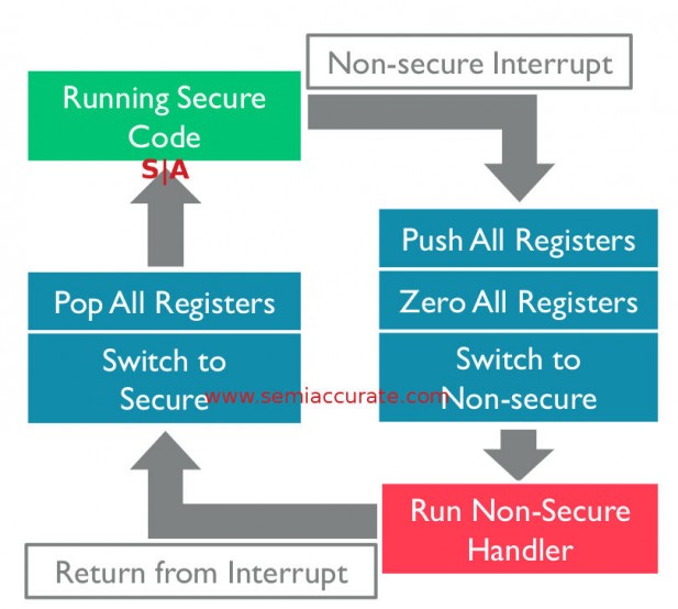 This doesn’t mean a NS interrupt can’t interrupt S code, it can. If it does, all registers are pushed, all registers zeroed, and the mode is switched to NS. The interrupt is then serviced, the mode is set to secure, all registers are reloaded, and the secure code keeps running. You might have noticed that the registers are zeroed on a S->NS transition but not necessarily in a NS->S one, a useful feature that can be useful for clever hacks.
