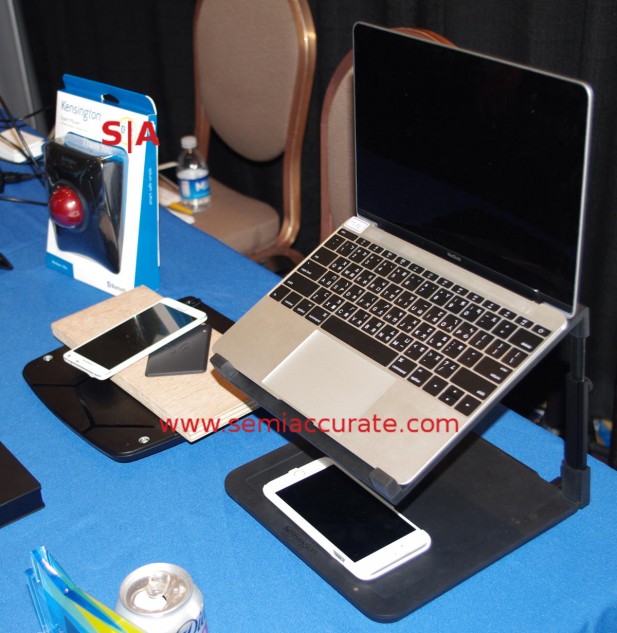 Between the Expert Mouse and the laptop stand is a charging pad demo which we will ignore because it is just a charging pad. More interesting is the laptop stand, it too is a charging pad, at least on the bottom hence the name Max Laptop Riser With Wireless Power. If you throw your devices under the keyboard, as long as they are Qi compliant, they will charge like magic. If only the top charged the laptop too, life would be a bit better but sadly things have not progressed that far on the laptop front, not the charging front. This stand should retail for about $99 and an M4WP version is being studied now too.