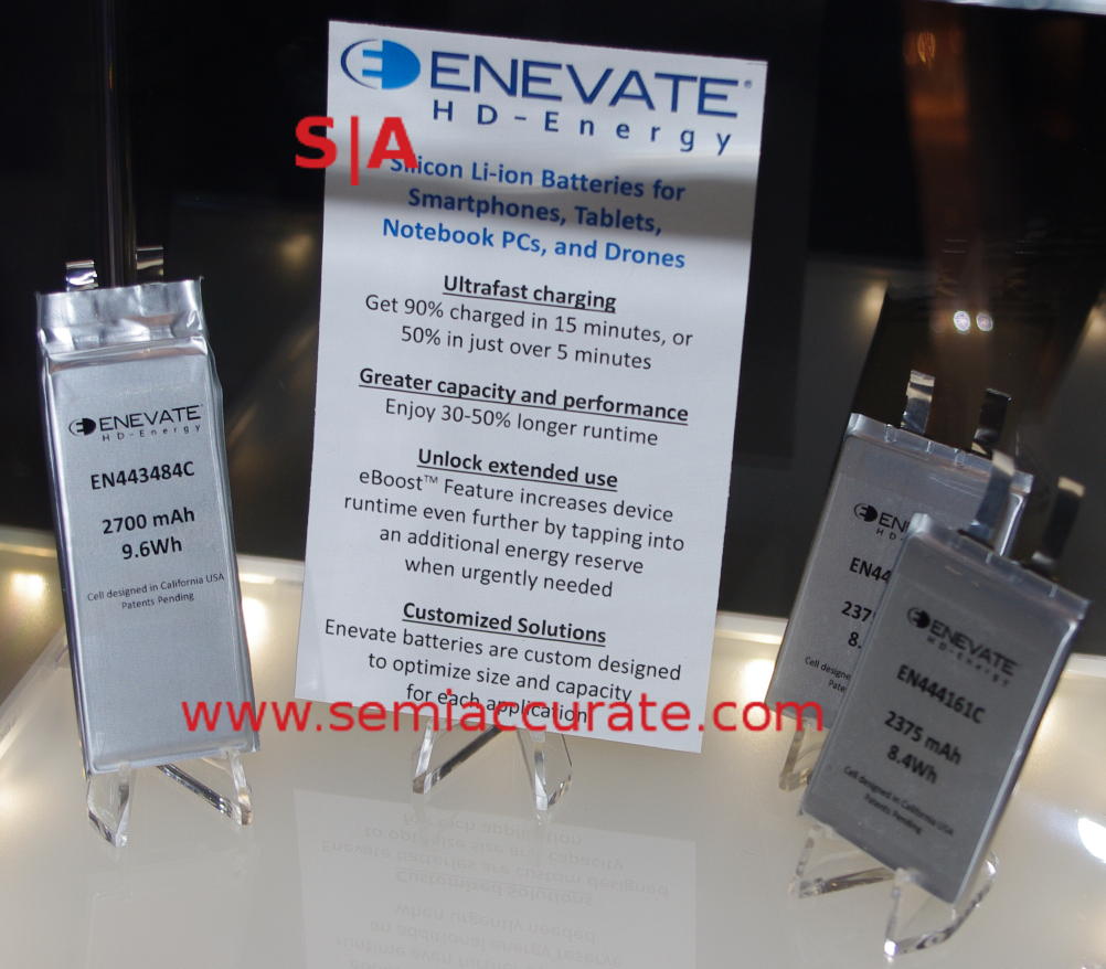 Enevate logoEnevate was showing SemiAccurate a new battery at CES, Silicon-Lithium-Ion. As with all new battery types it promises a fair number of advances, something which the underlying chemistry supports.
