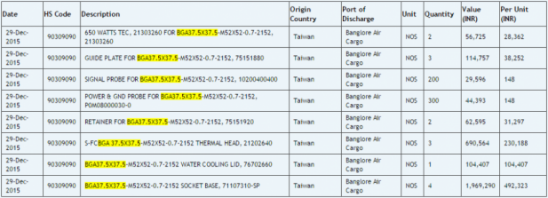 Again assuming this stuff is actually for Pascal, it says quite the opposite. Look at the manifest, they are all for things related to BGA37.5×37.5, or the aforementioned BGA socket. We will just call it BGA from now on to save time. What are these things, and why are they being shipped from Taiwan to Bangalore? Lets take a look.