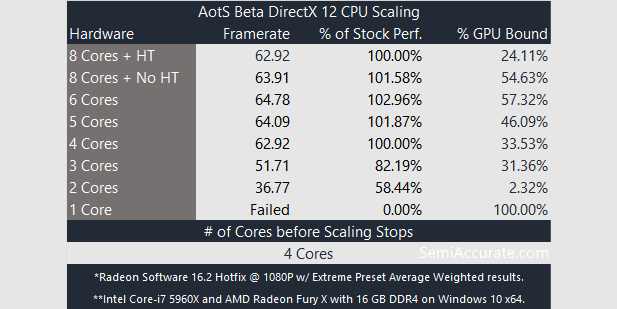 Bring this discussion back to the variety of different CPUs we tested in our initial AotS article we noticed that older CPUs with weaker single threaded performance and plenty of cores saw the largest performance gains when moving from DirectX 11 to DirectX 12-based rendering engine. The testing we’ve conducted today demonstrates why this is happening. DirectX 12 games scale to more cores than DirectX 11 games. In doing so the performance of a single core becomes less relevant and the combined performance of up to four cores becomes the limiting factor.