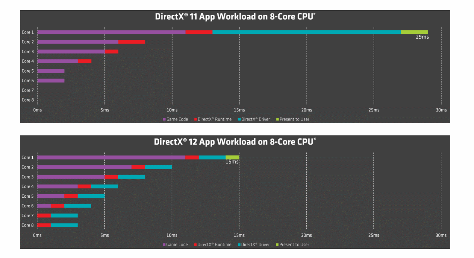 Now to be clear this doesn’t mean that in DirectX 12 four slower cores will perform just as well as four faster cores. Faster cores of an equal number will still be faster even if that core count is at the limit of the game engine’s ability to leverage multithreading. Rather it means that the performance gap between a small number of fast cores like an Intel Celeron or Core i3 and a larger number of slow cores like one of AMD’s FX or A-Series chips will be smaller under DirectX 12 than with DirectX 11. Of course this trend is going to be limited by a variety of factors including the relative performance of the two chips you’re comparing and how well upcoming DirectX 12 games take advantage of multithreading.