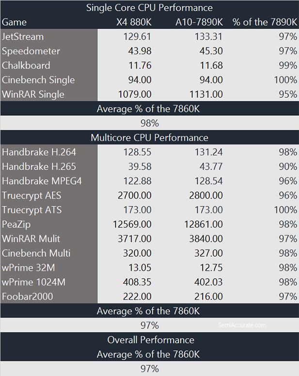 Again the Athlon X4 880K’s goal here is to beat out the A10-7860K and to match the A10-7890K. We won’t be looking at power consumption, gaming, or compute performance in this review because these chips aren’t directly comparable due to the 880K’s need for a discrete graphics card.