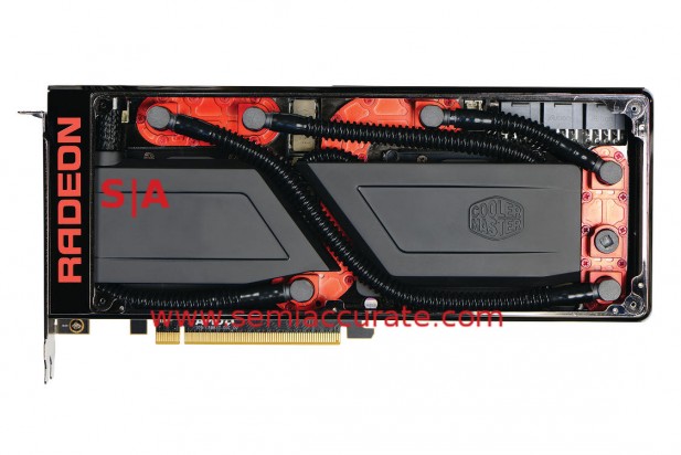 So what is it? Once again, it is still a dual Fiji card but it has changed a bit since the last time it was shown. Actually it changed quite a bit, there is now a dual Coolermaster closed-loop water cooling loop, an external radiator, and three rather than two 8-pin PeG links. Take a look at the shots below and note the PLX PCIe switch between the GPUs, quite impressive packaging for a 270mm long card.