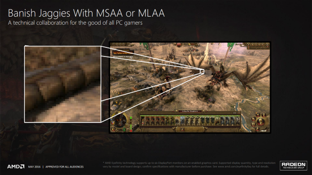 UPDATE 2/24/16 @ 11:06AM: We asked AMD if there was any difference between the version of MLAA present in their Radeon Software and the version present in Warhammer’s in-game menus; there is. AMD’s driver-based MLAA does not support DirectX 12 games.