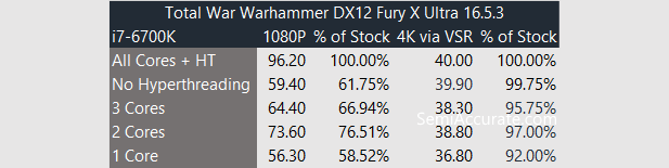 We do have a Fury X on hand and AMD gave a pre-release copy for Total War: Warhammer so we attempted to verify their performance claims. AMD quoted the Fury X at 39 FPS at 4K on the Ultra preset and our testing matched up nicely with a solid 40 FPS. At 1080P performance was excellent at 96 FPS. As we did with Ashes of the Singularity we decided to attempt to look at CPU scaling by disabling cores and running our benchmarks again. The result of which was a big drop in performance at 1080P and only a minor hit at 4K. Clearly our 4K performance testing is mostly GPU limited and Total War: Warhammer loves Hyper-threading unlike any other game I’ve ever seen. Also unlike Ashes of the Singularity, Warhammer will actually run with only a single core enabled albeit poorly.