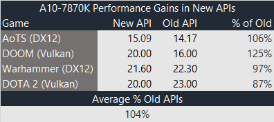 In Ashes of the Singularity, Warhammer, and Hitman we see a minor performance improvement. In DOOM we see a massive performance improvement and in DOTA 2 a big regression. I’m not sure what’s stranger: the massive boost in DOOM or the big hit in DOTA 2. DOTA 2’s Vulkan branch is still very much in beta so perhaps the regression here is a result of that and DOOM stellar results could be linked to the use of shader intrinsic functions. In any case these new APIs on average offer only as a minor performance boost for existing APUs.