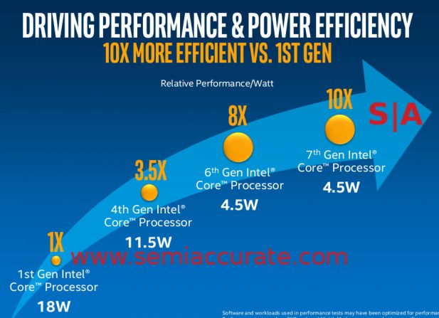 Raw performance like this doesn’t come for free unless you are Intel, then it comes from innovation. How much innovation? 10x, yes we are serious and do mean ten times over seven generations or eight years since the 1st Gen Core (Nehalem) launched on November 2008. If you run the numbers that is a whopping ~33% increase in efficiency per year. More innovative is the microarchitectural changes which, when removing the power, bring a stunning 2.5x performance increase in those same eight years. 12% single threaded performance increase per year for eight running, truly Stunning, Sensory, Active, and Engaging. That kind of 2.5x jump hasn’t been seen since the 386->486 change, or the 486->Pentium, or the Pentium ->Pentium II days.