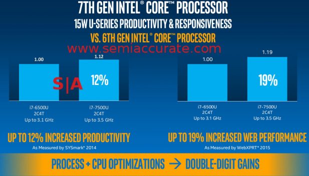 If you thought that was it, SemiAccurate wouldn’t use phrases like “innovation”, and “knocked one out of the park” without data to back it up. With the sheer amount of goodness in Kaby Lake, the obvious place to start is the performance and boy does this new CPU deliver. Intel uses phrases like, Stunning, Sensory, Active, and Engaging but all of that pales compared to the raw number crunching power of the new line. How good is it?