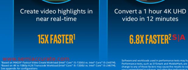 As you can see above, the numerous innovations and upgrades to Kaby Lake from Skylake exemplify why Intel chose to call this like 7th Generation Core rather than 6th Generation Core. The hardware 4K encoder delivers a 6.8x increase in performance versus a five-year old CPU, raw numerical performance rises “More than 70%” in that same 5+ years, a gain of nearly 12% per year. The only thing left to ask is why they didn’t call this innovation powerhouse 8th Generation Core, it deserves at least that much.S|A