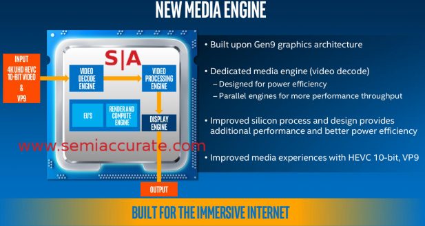 As you can see the changes from the 6th Gen Core line GPU to the one in the 7th Gen Core are massive, massive and green. Not only is all this real estate upgraded but they contain added modes. Yes you heard that right, Kaby Lake can now do 10b HEVC and VP9 encode and decode at nearly realtime speeds on top bin SKUs, can your cell phone or discrete GPU do that? Only if they are older than Kaby Lake and it’s innovative GPU. The same goes for HDR processing and Rec.2020 wide color gamut support. In future generations the Intel GPU itself will be upgraded to drive a 4K screen without lag in things other than video playback but at the moment some of the 7th Gen Core CPUs can transcode movies down to a supported 1080p screen without lag for a Stunning, Sensory, Active, and Engaging experience.