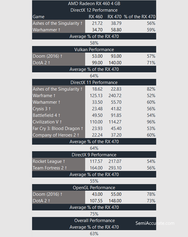The RX 460 offers somewhere between 52 percent and 82 percent of the performance of the RX 470. This is good given that this RX 460 is only about $40 cheaper than the cheapest RX 470 models. The price/performance gap is pretty linear all things considered and a far cry from the just-barely-better-than-integrated-graphics ~$100 to $150 GPUs of five years ago.