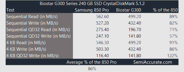In terms of performance the G300 is a little bit behind Samsung’s popular 850 Pro. But while the 256 GB version of the 850 Pro that we tested here cost $122 the 240 GB G300 costs about half as much at $66. The 120 GB model is $44 and the 480 GB model is $140.
