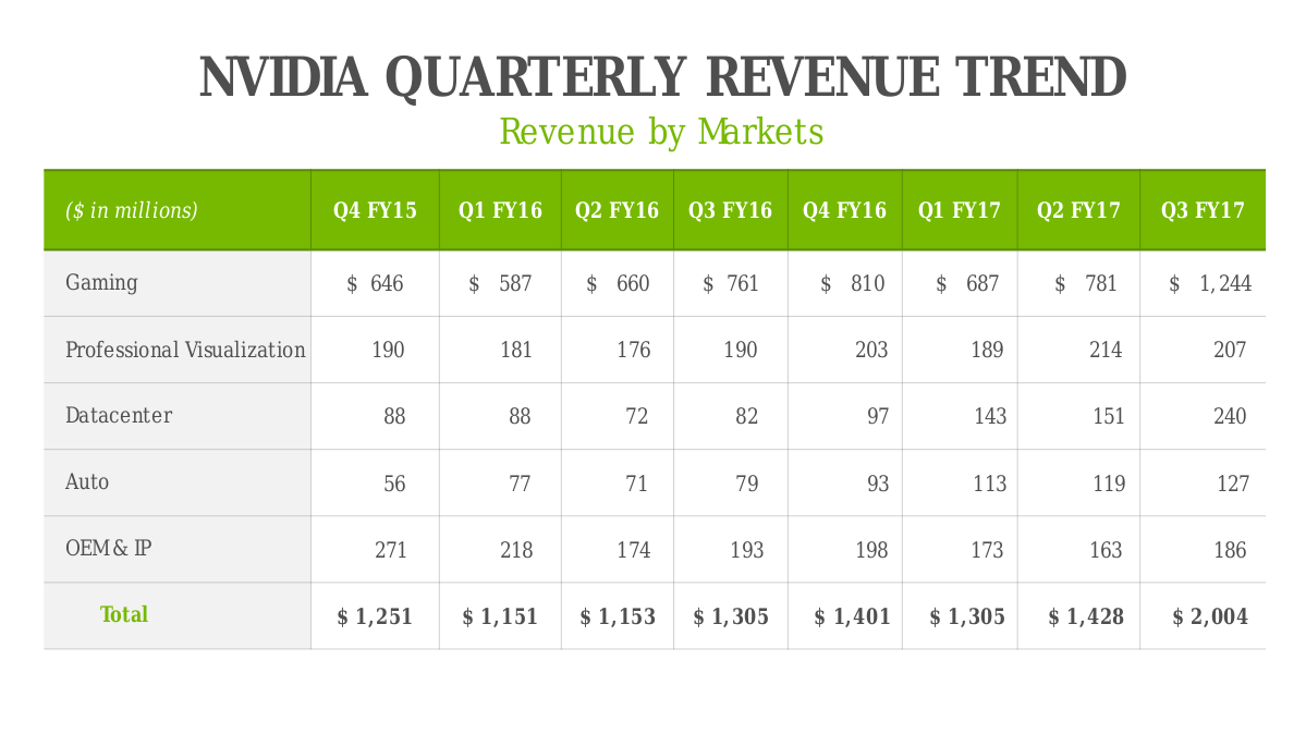 Last Thursday Nvidia dropped it’s Q3 2016 (FY2017) results and crushed financial records all over the map. Revenue for the quarter was a cool $2 billion up 54 percent from a year ago when Maxwell was still the company’s primary product. To say that Pascal has given Nvidia a new lease on life seems like a bit of an understatement. Looking at quarterly revenue over the past two years Nvidia’s booked between $1.1 and $1.4 billion while it shipped its Kepler and Maxwell-based GPUs. Now that the company has nearly completed the rollout and ramp up of its Pascal architecture Nvidia has finally managed to escape the relatively slow rate of growth it’s struggled with over the past few years.