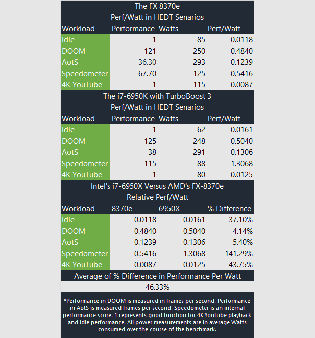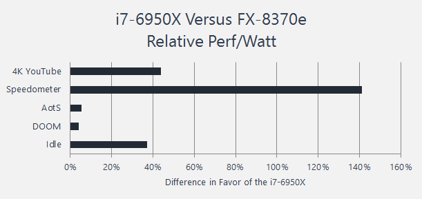 For workloads where performance is measured through function, we’ve used 1 to represent adequate function. Averaged across all of these benchmarks the 6950K offers about 46 percent better performance per watt. Looking at the individual scenarios in these tables it’s apparent that there’s more to this story.