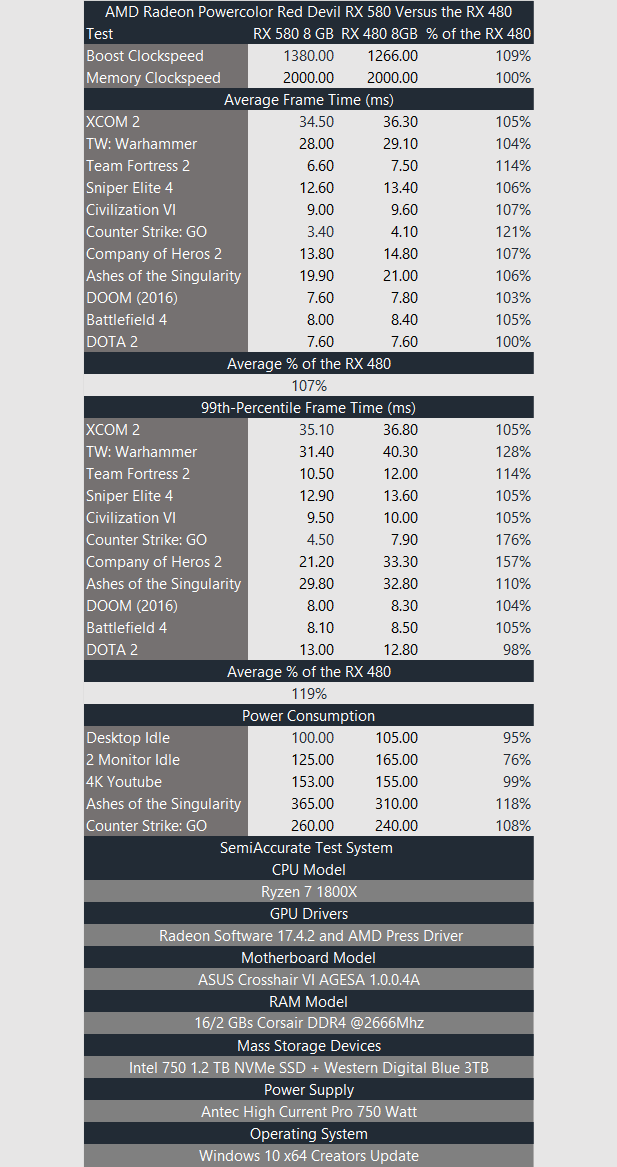 The whatever AMD’s done to enhance the RX 580 it seems to have a bigger impact when we look at 99th-Percentile frame times than at average frame times. We see large improvements in Counter-Strike: GO, Company of Heroes 2, and Total War: Warhammer. In other games, the improvement in 99th-Percentile performance is in line with the modest gains we’re seeing in average frame times.