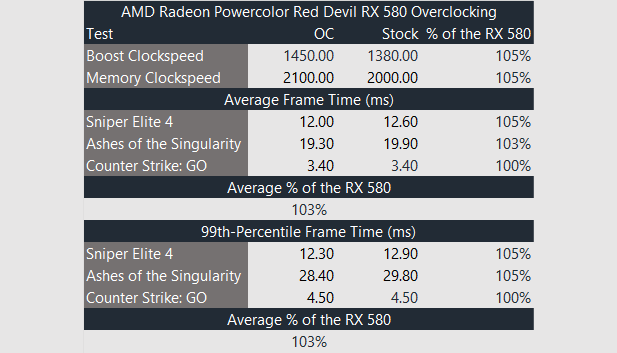 With a 5% boost to core and memory clock speeds, we see an almost linear gain in performance. Counter-Strike: GO was unaffected, but we were already seeing excellent performance in this game with the stock RX 580.
