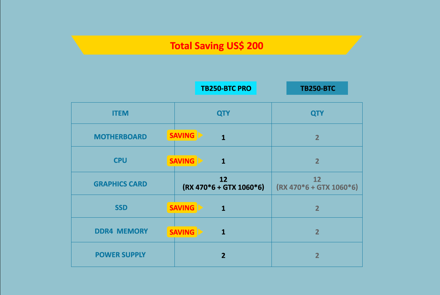 With 12 GPUs working simultaneously on the BIOSTAR TB250-BTC PRO, this allows miners to rapidly gain their ROI faster than conventional setups. Possible rigs include 2-speed machines featuring GPUs from both AMD and NVIDIA allowing combined performance to provide miners with the ability to quickly adjust to the most profiitable virtual currency they want. See chart below for a quick comparison which shows the combined hashrate offered by a single platform powered by the BIOSTAR TB250-BTC PRO versus two rigs running different GPUs. The mining rig running TB250-BTC PRO receives a return of investment (ROI) in only 79 days versus 97 days for the separate systems.